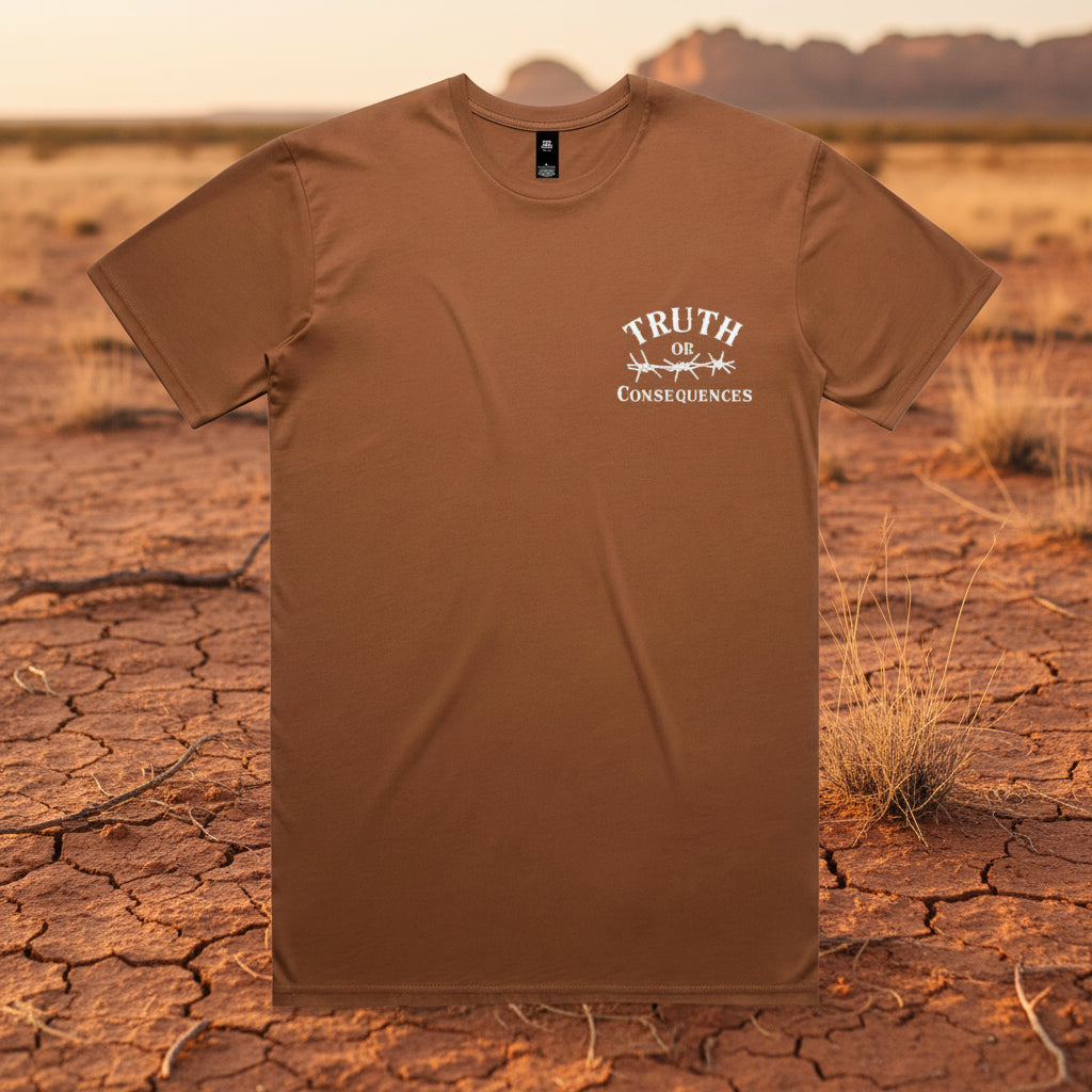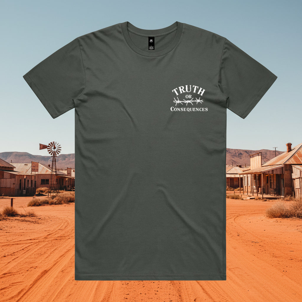Truth or Consequences... classic style with a western twist. Long horn skull detail on back gives this shirt an apocalyptic desert vibe...something you'd find riding through the New Mexico desert town this collection is named after. Enduring comfort in a regular fit, crafted from 180 GSM 100% combed cotton. Featuring neck ribbing, side seams, and double needle hems for durability and minimal shrinkage, it's a timeless choice for comfort and style. Built to last. Relaxed unisex fit.
